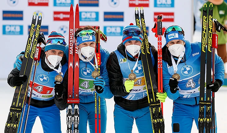 1. Норвегия (Стурла Хольм Лагрейд, Тарьей Бо, Йоханнес Бо, Ветле Шостад Кристиансен) – 1:12.27,4 (0+8)2. Швеция (Пеппе Фемлинг, Йеспер Нелин, Мартин Понсилуома, Себастьян Самуэльссон) – 33,1 (0+7)3. Россия (Карим Халили, Матвей Елисеев, Александр Логинов, Эдуард Латыпов) – 50,9 (0+5)4. Франция (Антонин Гигонна, Кентен Фийон-Майе, Симон Дестье, Эмильен Жакелен) – 1.02,0 (1+11)5. Украина (Богдан Цымбал, Дмитрий Пидручный, Артем Прима, Антон Дудченко) – 1.12,7 (0+4)6. Италия (Дидье Бьона, Лукас Хофер, Томмазо Джакомель, Доминик Виндиш) – 1.35,5 (2+14)7. Германия (Эрик Лессер, Роман Реес, Арнд Пайффер, Бенедикт Долль) – 1.43,2 (0+4)