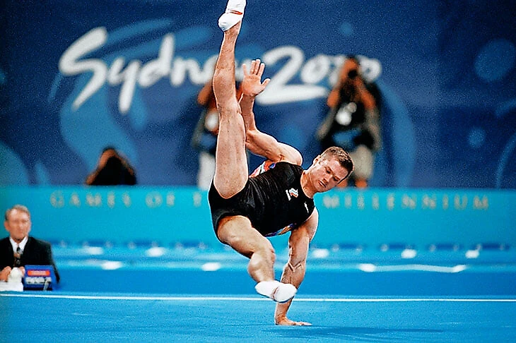 Насколько я знаю, он долго готовил коронный элемент, собирал его по кусочкам, тренировал сначала на батуте, потом перенес в зал. Есть даже раскадровка: