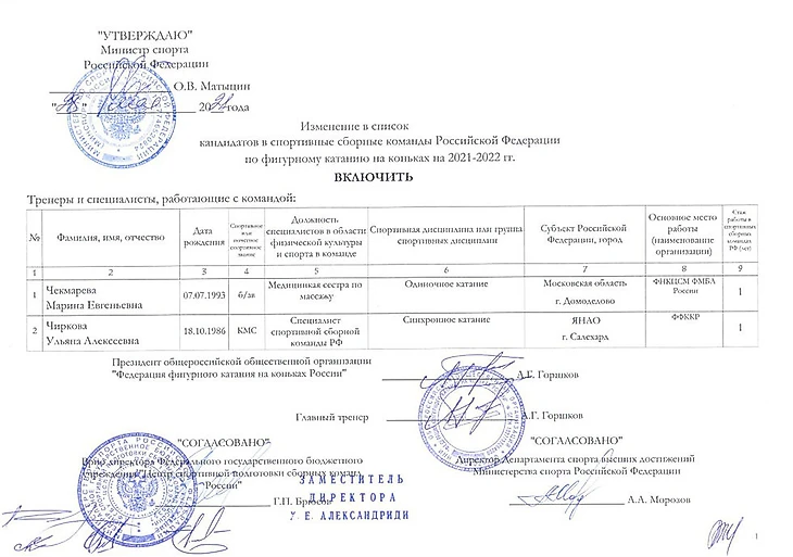 Марина Чекмарева – медсестра по массажу из ФМБА, работала в гимнастической сборной у Ирины Винер. В олимпийском сезоне-2021/22 Чекмареву отдельным приказом Минспорта включили в фигурную сборную.