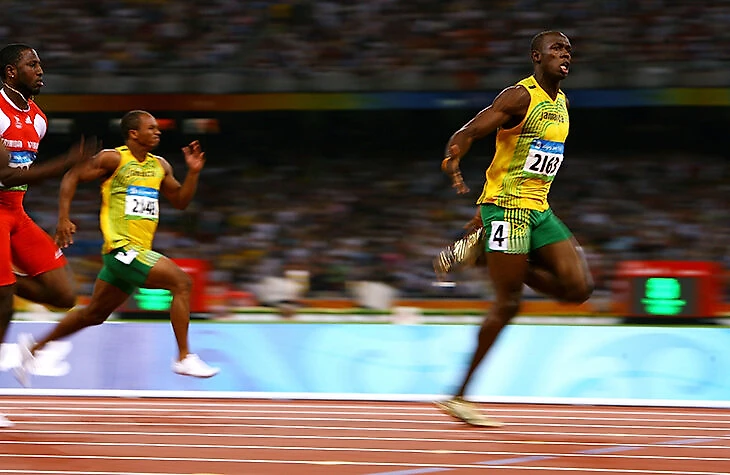 Усэйн Болт на пике 100-метровки (указывают, что это было на отрезке 60-80 метров) выдавал скорость 44,2 км/ч.