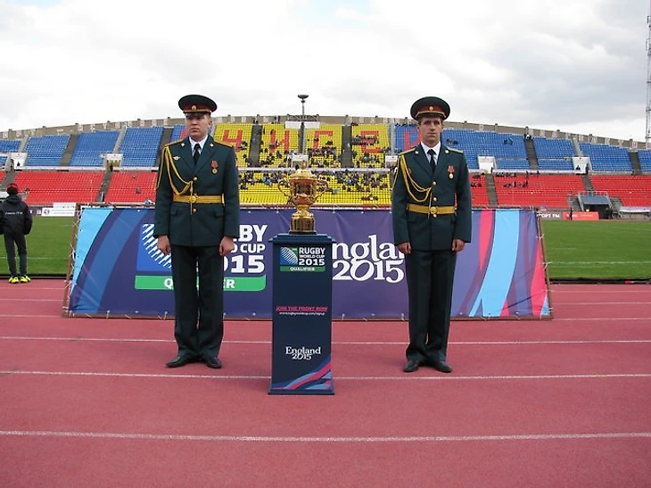 Незадолго до игры на беговые дорожки вынесли тот самый Кубок мира, за который и будут играть в 2015-м в Англии – Кубок Уильяма Вебба Эллиса.