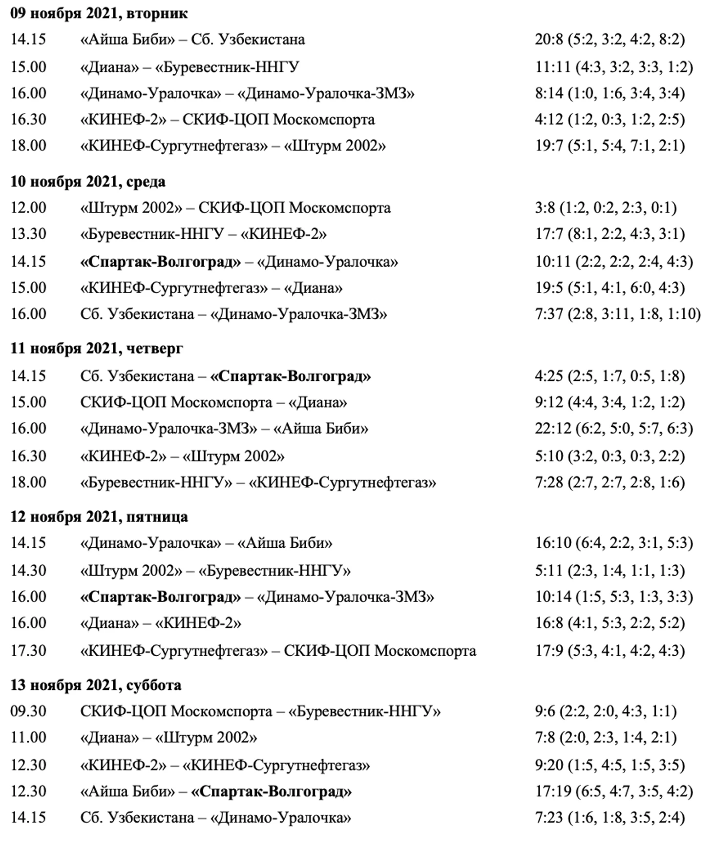 Матчи следующего тура пройдут в Волгограде с 3 по 7 декабря, где сыграют «Спартак-Волгоград», «Кинеф», «Кинеф-2», «Диана», «ЮГРА» и сборная Узбекистана. В Рузе с 5 по 9 декабря сразятся СКИФ, «Штурм-2002», «Буревестник», «Динамо-Уралочка», «Динамо-Уралочка ЗМЗ» и «Айша-Биби».