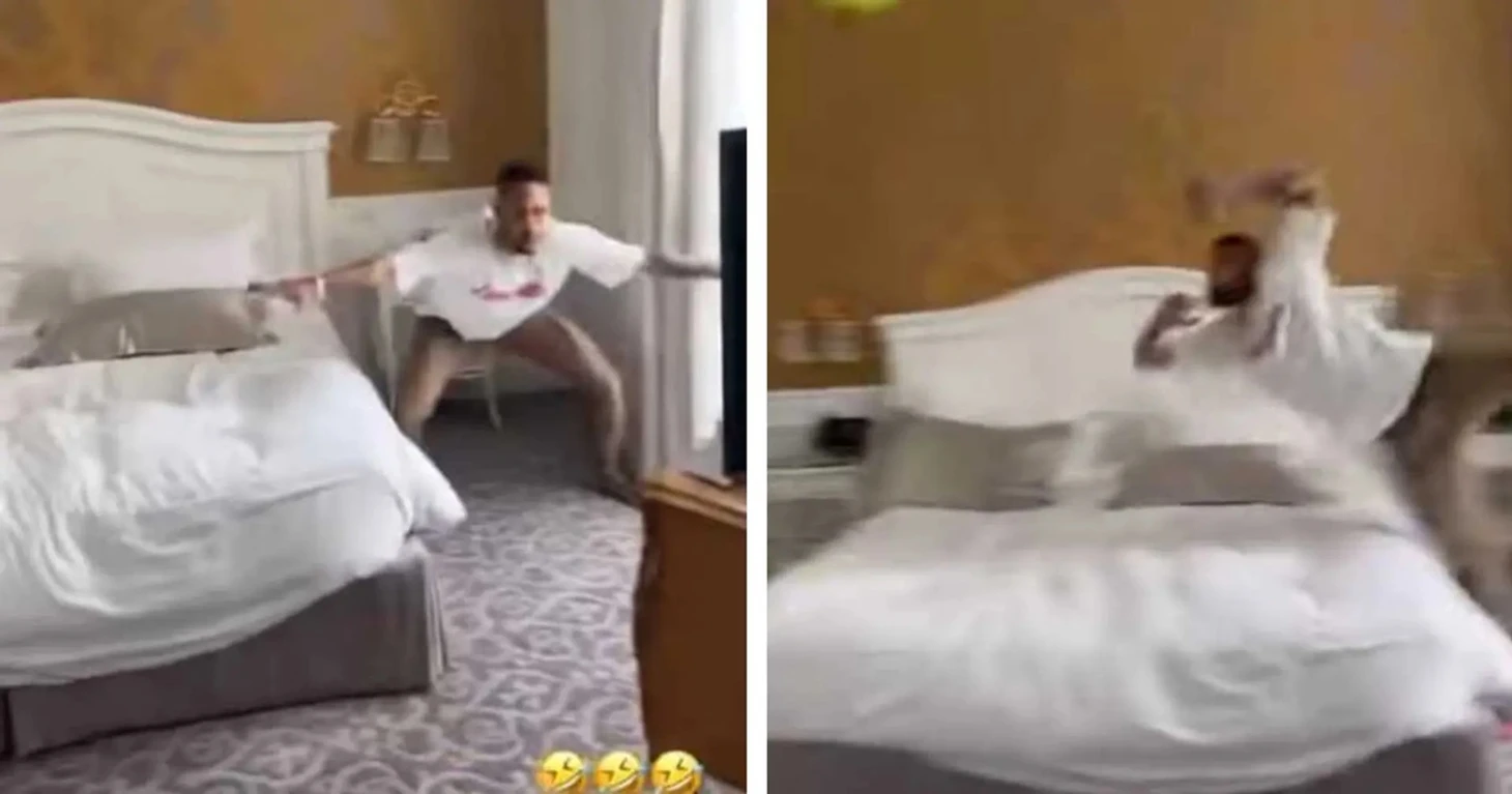 Неймар только что опубликовал видео в Instagram stories, на котором он в номере отеля изображает вратаря на кровати.