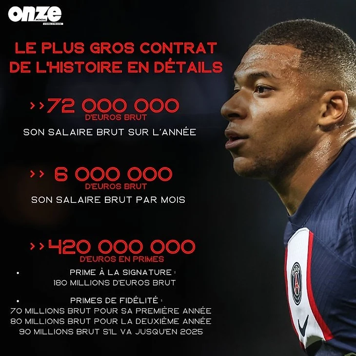 Неизвестно, считает ли ресурс зарплату француза в «чистыми» или «грязными», но по данным авторитетного ресурса Capology по новому контракту с «ПСЖ» Мбаппе зарабатывает 50 млн евро «чистыми» или 90,91 млн евро до уплаты налогов.