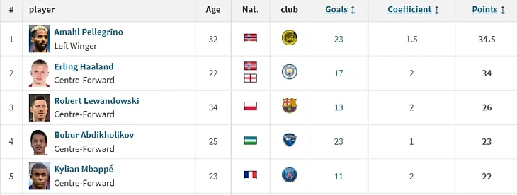В гонке за «Золотую бутсу» лидирует норвежец – но ему 32, и он вингер. Как Амаль Пеллегрино обогнал Левандовски и Холанда