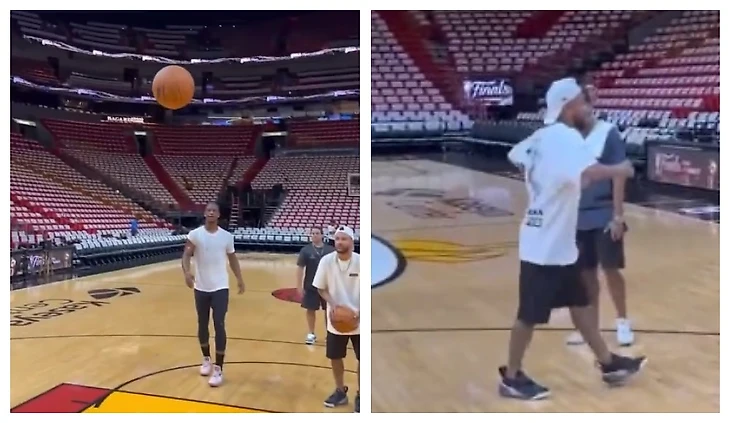 Бразилец тренировался вмести с лидером «Хит» Джимми Батлером и умудрялся забивать даже ногами, что лидеру финалистов НБА не удалось.
