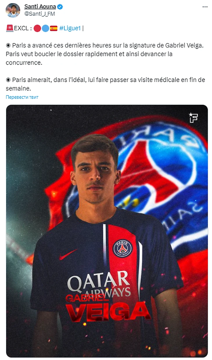 «В последние часы Париж добился прогресса в подписании Габриэля Вейги. Клуб хочет быстро закрыть сделку и тем самым опередить конкурентов. В идеале он должен пройти медобследование в конце недели».