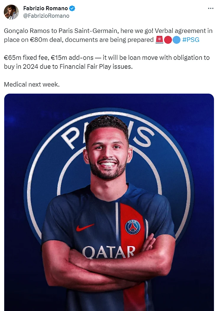 «Гонсалу Рамуш в «Пари Сен-Жермен», поехали! Достигнута устная договоренность о трансфере за 80 млн евро, документы готовятся.