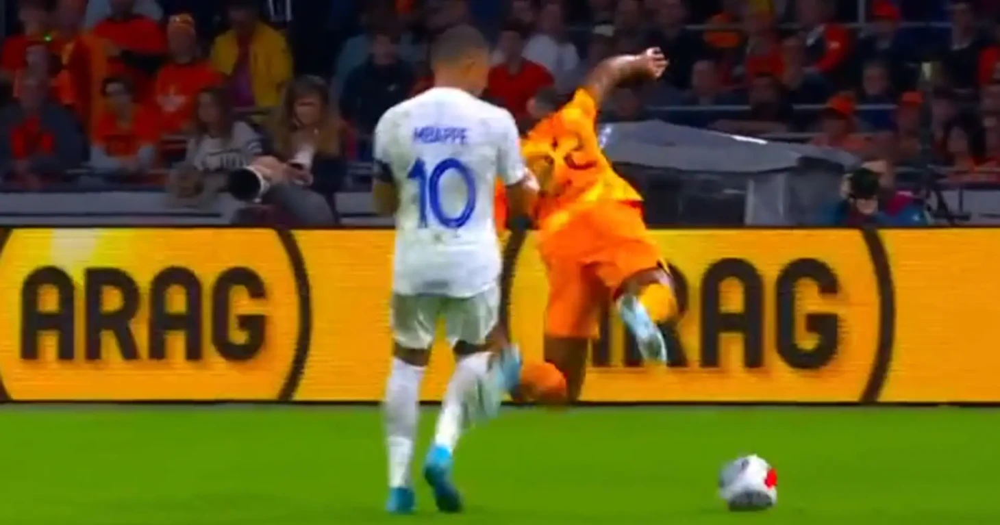 В концовке первого тайма игрок «ПСЖ» боролся за мяч с Думфрисом. Килиан рукой коснулся спины оппонента, после чего болельщики увидели эффектное падение Дензела.