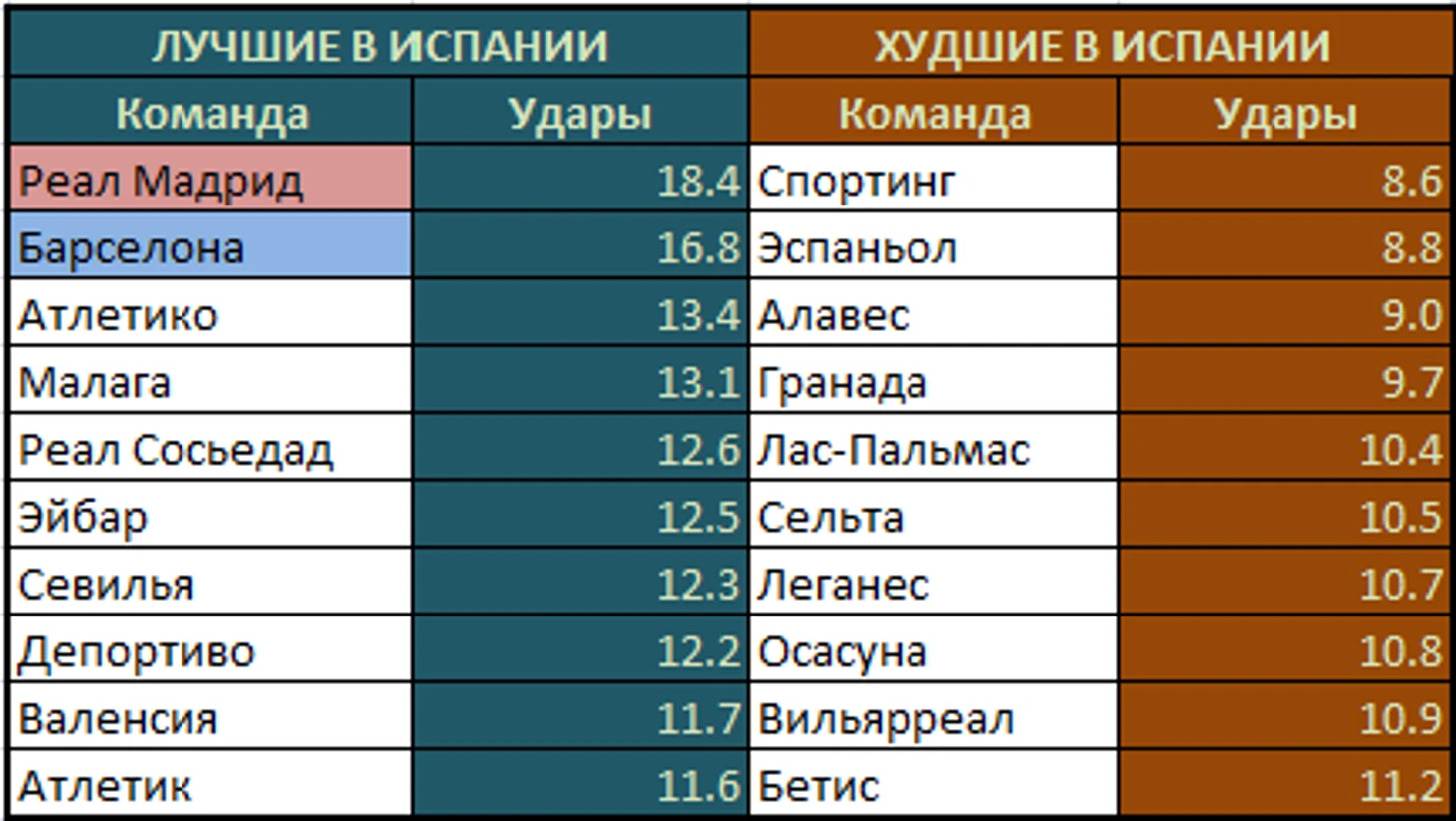 Традиционно предупреждаю – обходимся без претензий на глубокий анализ. В расчет берется только статистика во внутреннем чемпионате. Практически все цифры представлены по версии OptaSports и могут отличаться от цифр в других источниках. Для наглядности и удобства тех, кого интересуют только два клуба, цветом выделили показатели «Мадрида» и «Барселоны».