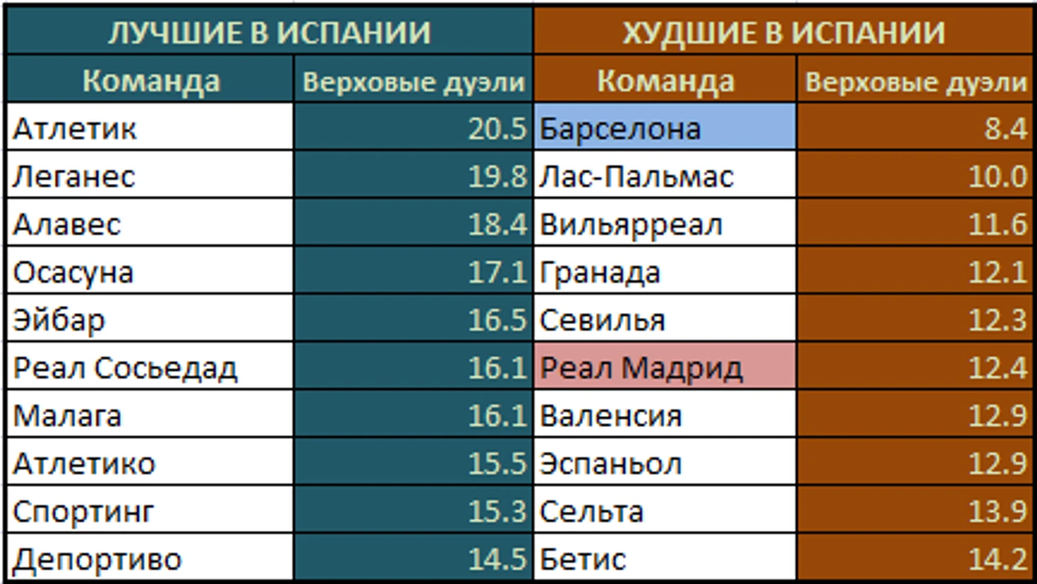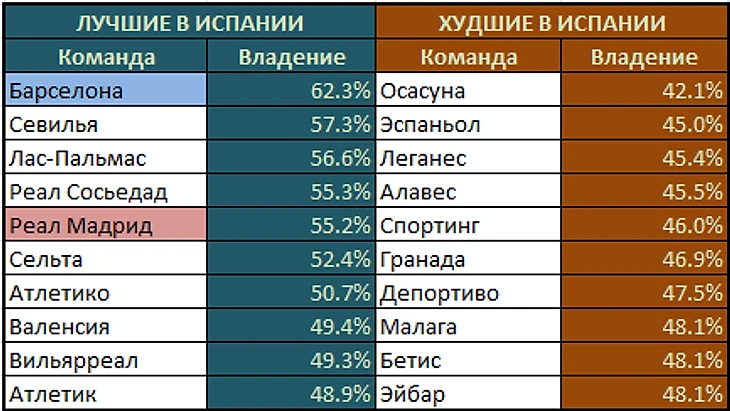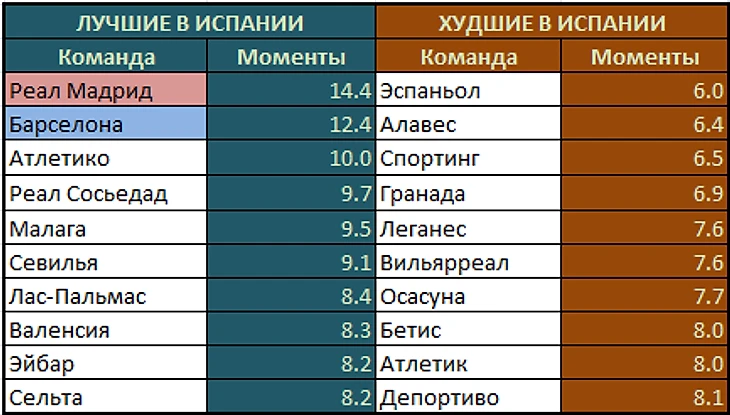 На первый взгляд кажется, что ничего необычного в картинке нет. Но это если не знать контекст. Лучшими командами по этому показателю год назад были «Депортиво» и «Атлетико». Причем динамика у «Депора» просто какая-то сумасшедшая, как в плане плюса, так и в плане минуса.
