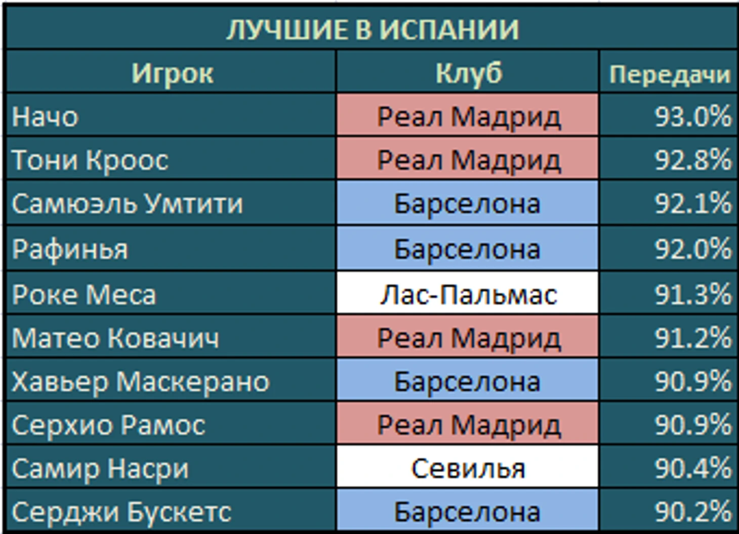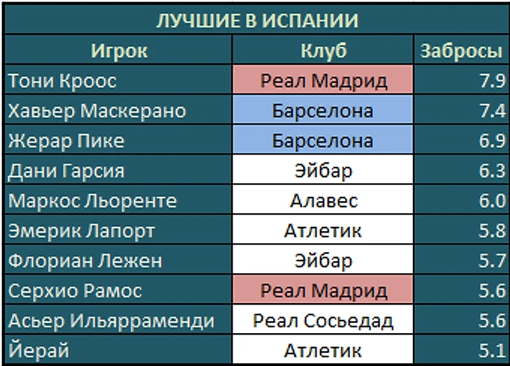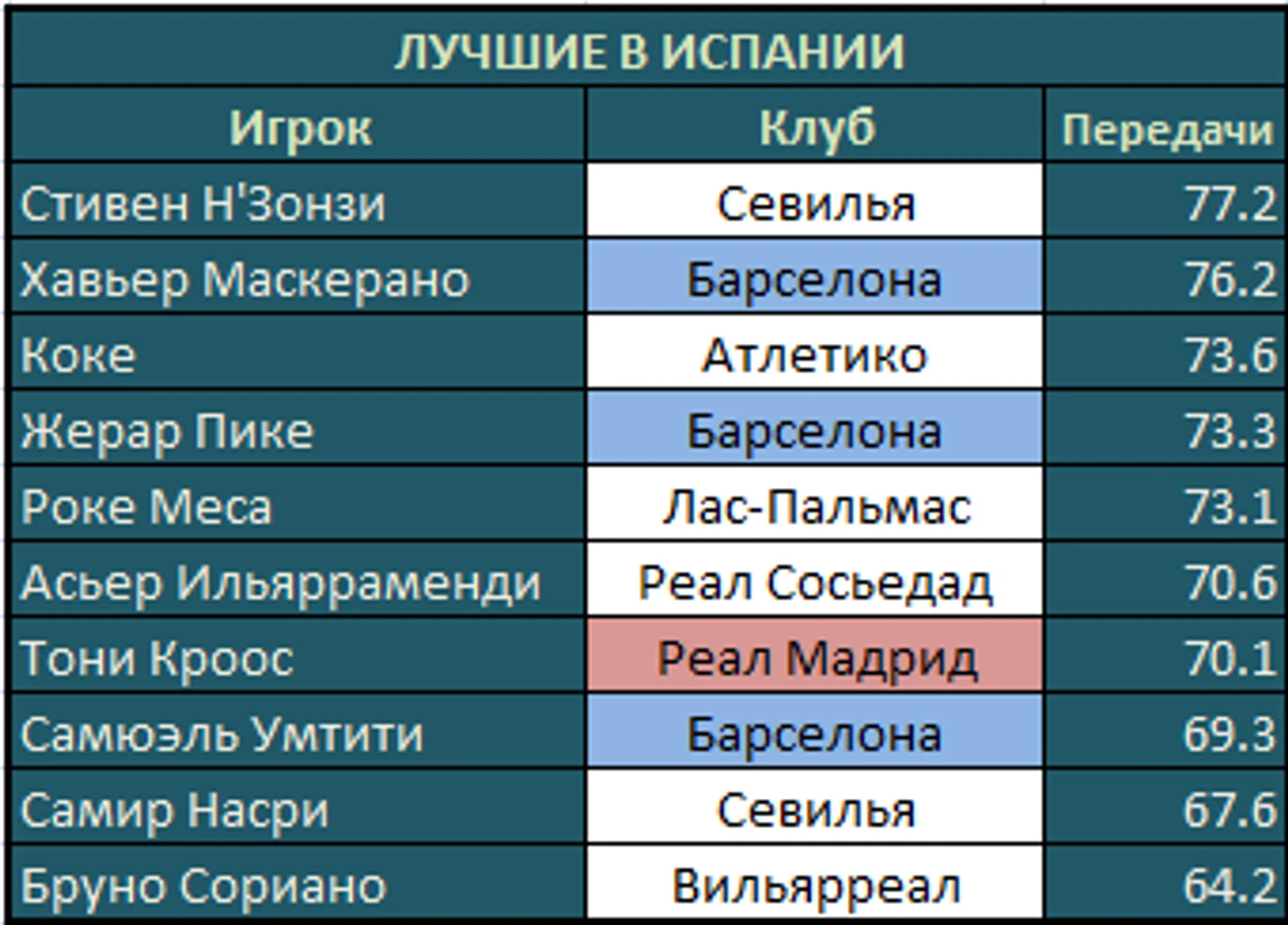 Без учета вратарей, само собой. Этот рейтинг тоже был ранее назван в честь Трашорраса, но теперь и его к рукам прибрал вездесущий Тони Кроос. Маскерано и Пике хорошо прибавили, что объяснимо, раз мы выяснили про их активное использование в пасовой игре.
