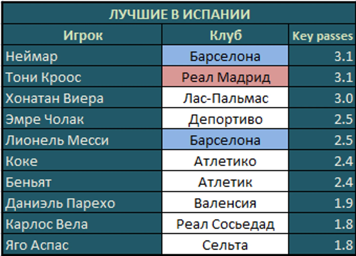 Напоминаю, что «ключевые передачи» в терминологии Opta – это передачи, после которых наносится удар по воротам. Один из самых статистически престижных показателей, особенно в Испании, где такое традиционно любят и ценят.