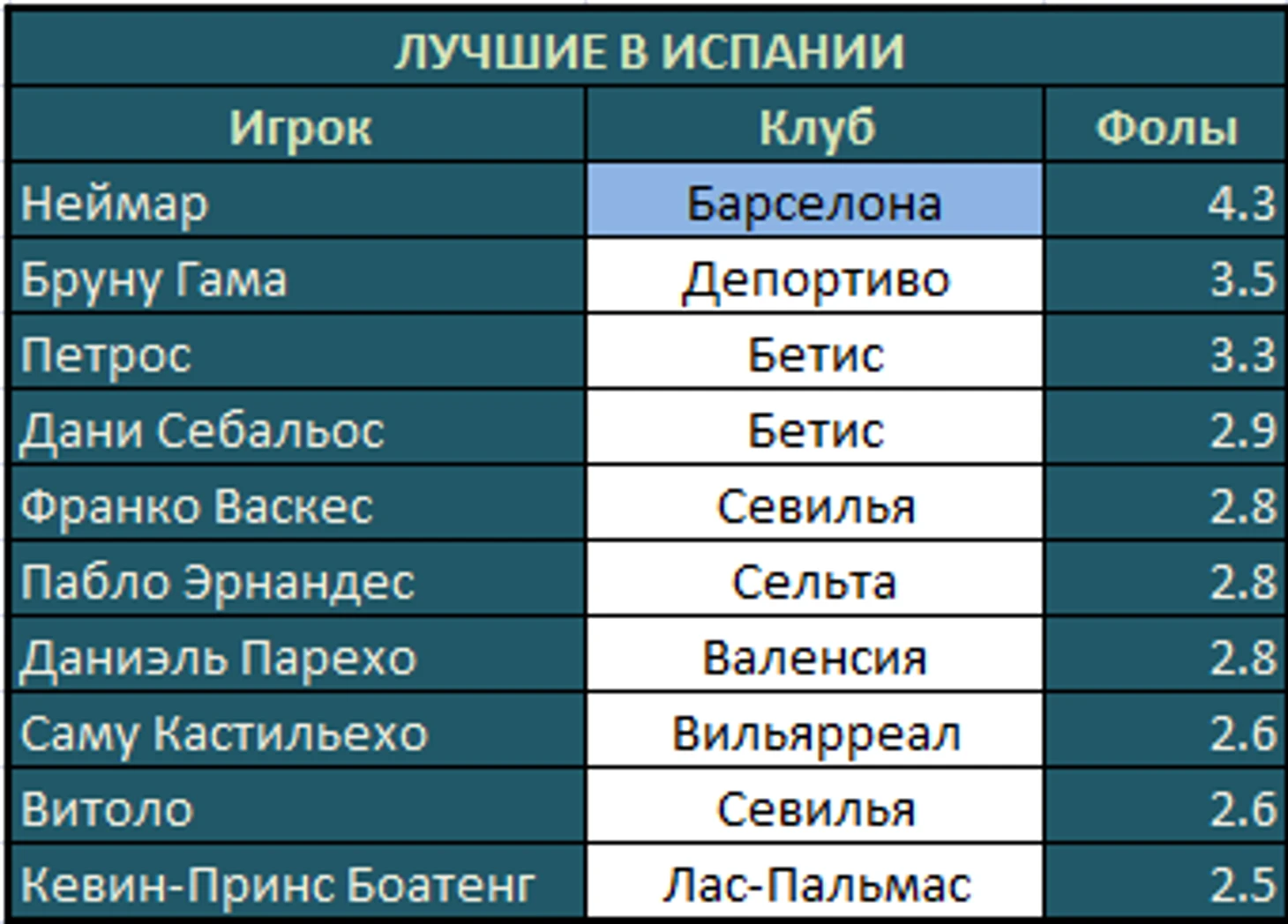 Лидерство Неймара старо и неоспоримо. Пабло Эрнандес и тут – есть такие игроки, которые и сами фолят много и много фолов собирают.
