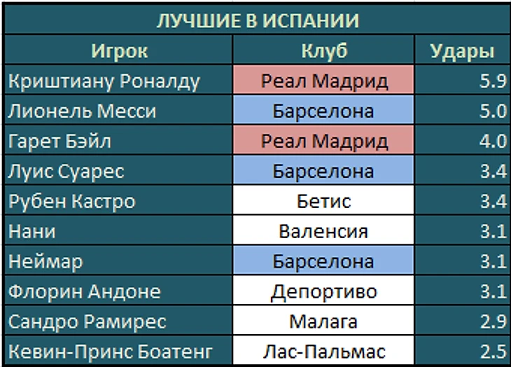 Роналду частью ударов поделился с Бэйлом (+0.5), который из года в год наращивает эти показатели. Бензема совсем выпал из топ-10, хотя год назад бил почти столько же, сколько и Бэйл.