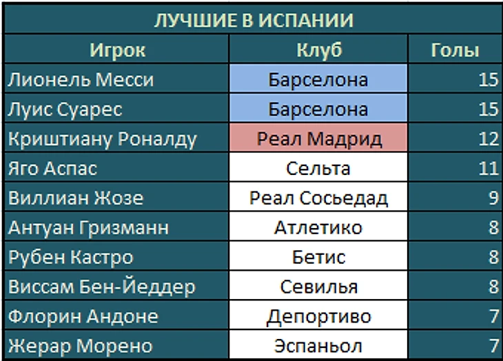 В целом картина удивительно похожа на прошлогоднюю. Тоже два нападающих «Барселоны» на вершине (хотя тогда вместо Месси был Неймар, воспользовавшийся травмой аргентинца), за ними Роналду с 12 мячами, а ниже Гризманн с 8 мячами и забивные парни из середняков.