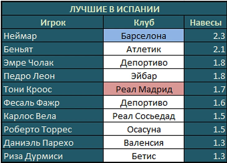 Неймару удалось прибавить в 0.7 навеса за игру и сместить с трона Беньята «Где Адурис?» Эчебаррию. Но эту категорию я терпеть не могу, потому что никак не могу запомнить, как по-русски правильно пишется Фесаль Фажр.