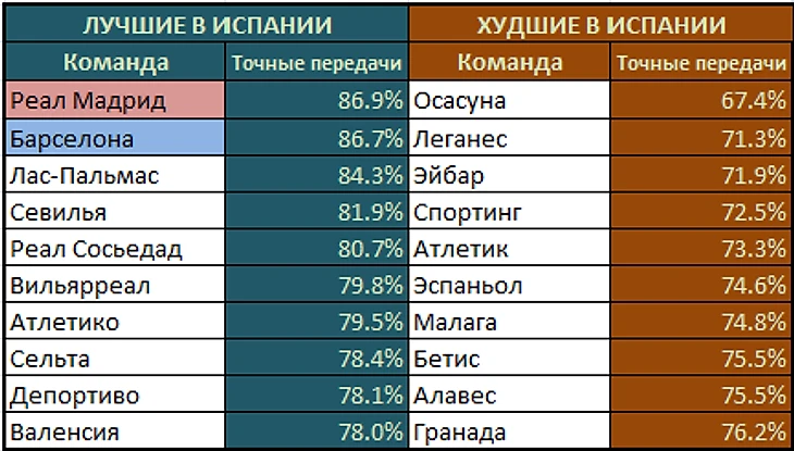 Мы стали лучше играть в пас! В среднем, испанские команды стали отдавать передачи точнее на один процент. Обозначим отличников: «Вильярреал» (+6.2%), «Эйбар» (+5.6%), «Лас-Пальмас» (+4.8%), «Депортиво» (+4.4%), «Севилья» (+4.1%), «Реал Сосьедад» (+3.0%). Неудивительно, что практически все команды из списка прибавили в результатах, а футбол их стал более зрелищным, чем год назад.