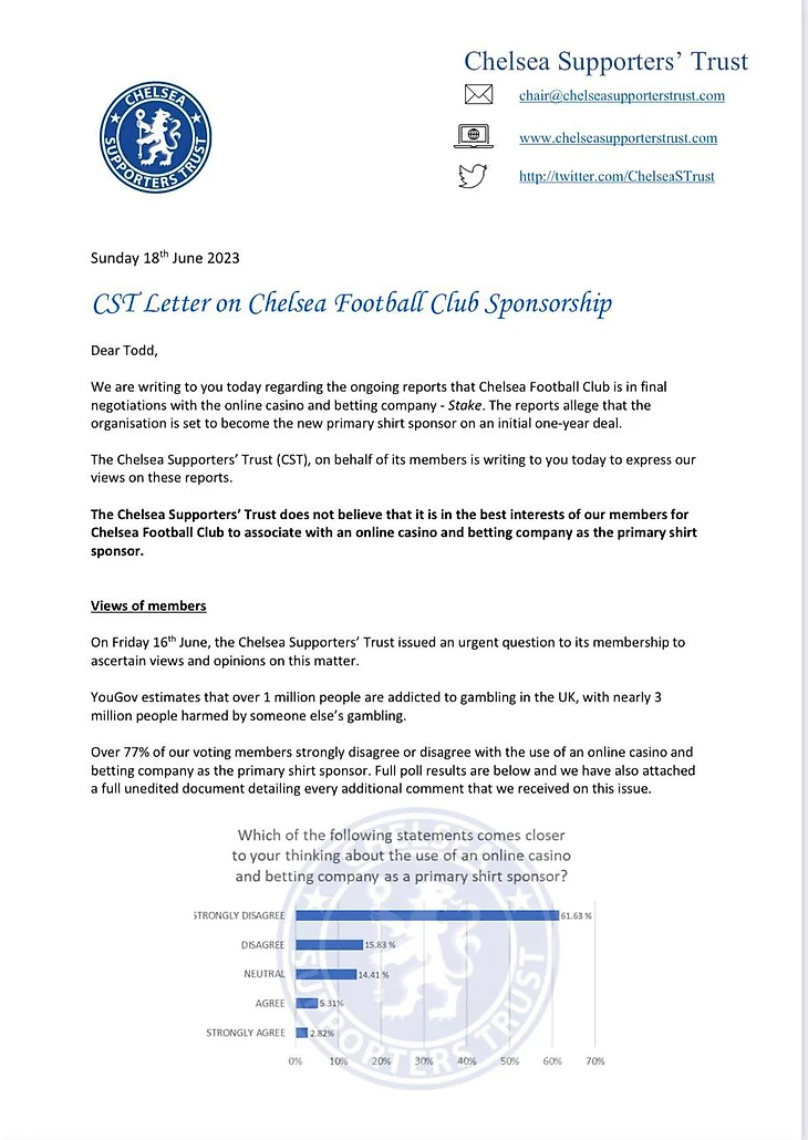 Письмо участникам «Chelsea Supporters Trust» по поводу контракта со «Stake».