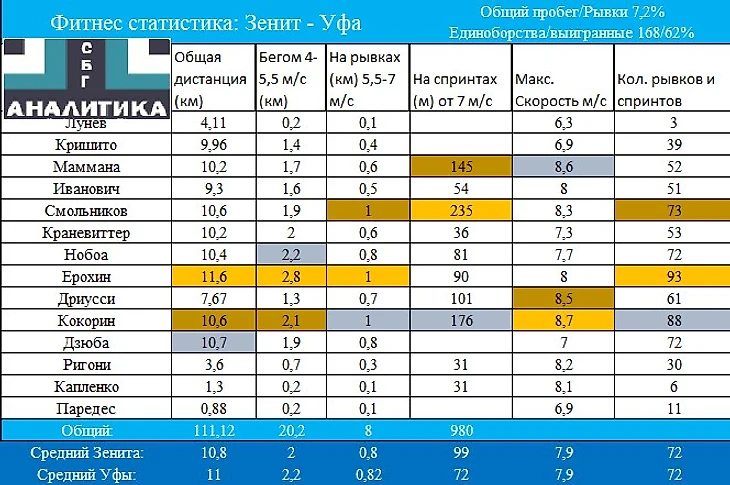 1)Наконец-то появилась возможность подкрепить цифрами утверждение о отличной работоспособности Ерохина и повышенных объемах работы. Саша лучший с большим отрывом по общей дистанции(почти км разница со вторым пробегом команды, это пропасть), по дистанции бегом и на рывках, а также по количеству рывков и спринтов. Настоящая рабочая лощадка, теперь вопросов почему он в составе будет меньше.