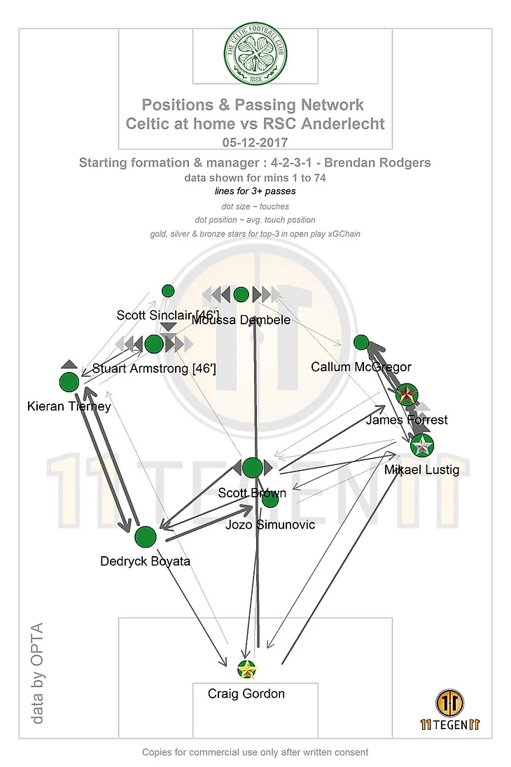 3. В ответном матче в декабре, Селтик мог себе позволить отсидеться в обороне, для выхода в ЛЕ им достаточно было крупно не проиграть Андерлехту. Селтик отдал мяч гостям и играл на контратаках через фланги, вообще без центра поля, количество вертикалей зашкаливало, карта передач ниже. На свой гол шотландцы наиграли, но все таки проиграли в общем-то ничейный матч 0:1, но и этого было достаточно для выхода в евровесну.