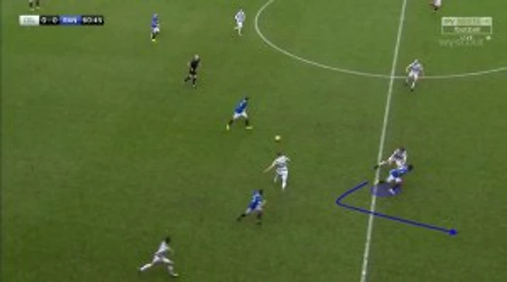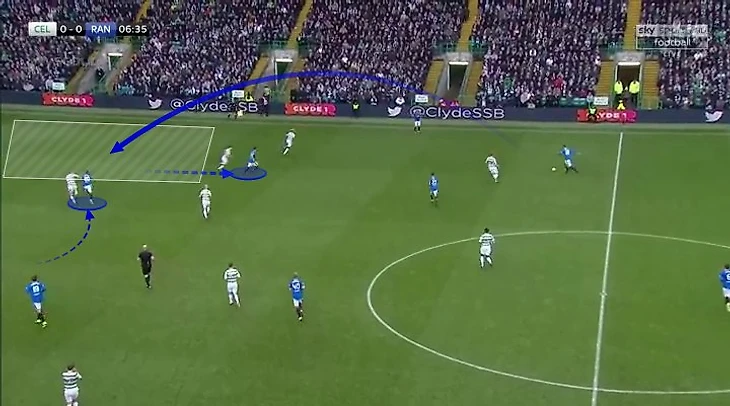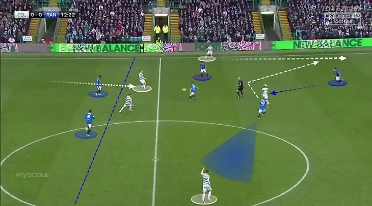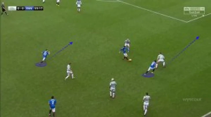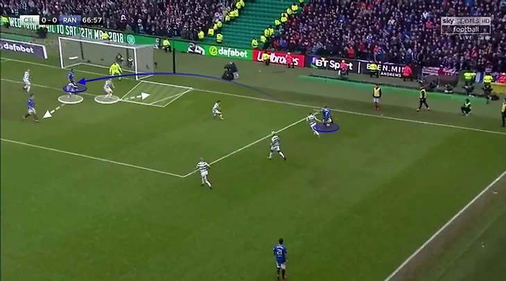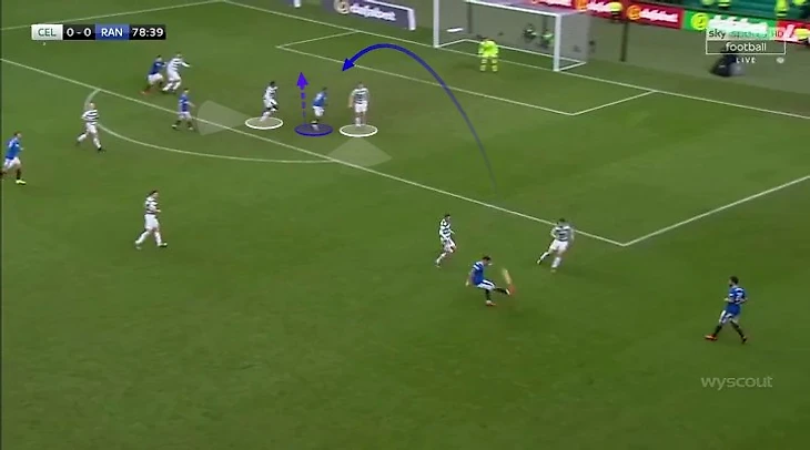 Простой, но эффективный способ доставки мяча в финальную треть, который использовал Рейнджерс: Смещение вингера в глубину поля, уводя за собой одного из защитников, в освободившуюся зону за спину Кандеяша тут же следует заброс, под который уже открывается центрфорвард Рейнджерс.