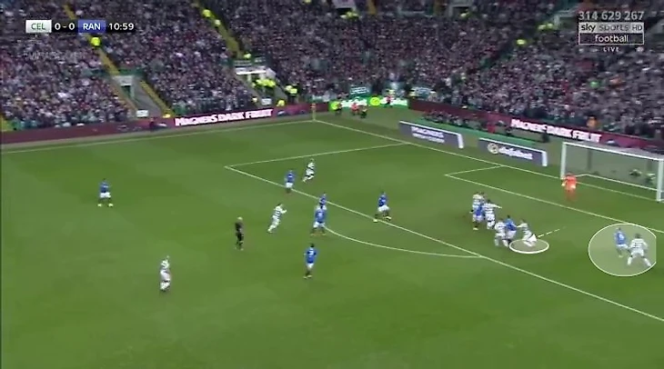 Вернемся к левому флангу Селтика в дерби. Немного теории, при кроссе с фланга, ближний к мячу центральный защитник играет по мячу (например чтобы из-за спины никто не выскочил перед защитником навстречу передаче), то есть смотрит на мяч и не держит своего игрока, напарник по центру обороны должен прикрыть спину и взять его игрока. Если открыты другие соперники, то их в зависимости от тактической ситуации должны разобрать крайний защитник и опорники, но абсолютный приоритет второго центрального защитника – закрыть игрока за спиной коллеги, за редкими специфическими исключениями. В ситуациях на скриншотах Боята (темнокожий ЦЗ) с описанной задачей не справился и слишком поздно переключался на нужного игрока, Рейнджерс имел неплохие шансы забить. Обращаем внимание, насколько спокойно синие подают с этого уязвимого фланга.