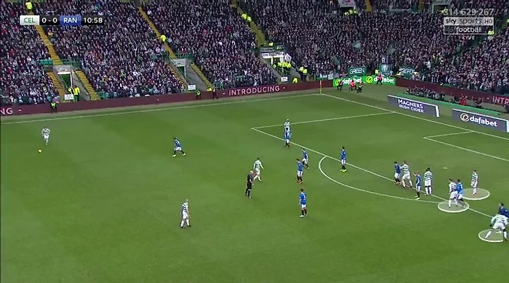 При стандартах Селтик часто использует заслоны, один из кельтов ставит корпус на пути игрока Рейнджерс, чтобы свой игрок освободился от опеки или единобрства. Пример на скриншотах ниже – игрок Селтика изначально располагается в оффсайде чтобы поставить заслон набегающему в штрафную игроку. Чуть левее также видим ситуацию большинства Селтика 2 в 1, Дембеле ставит заслон, пуская партнера в забег без опеки.
