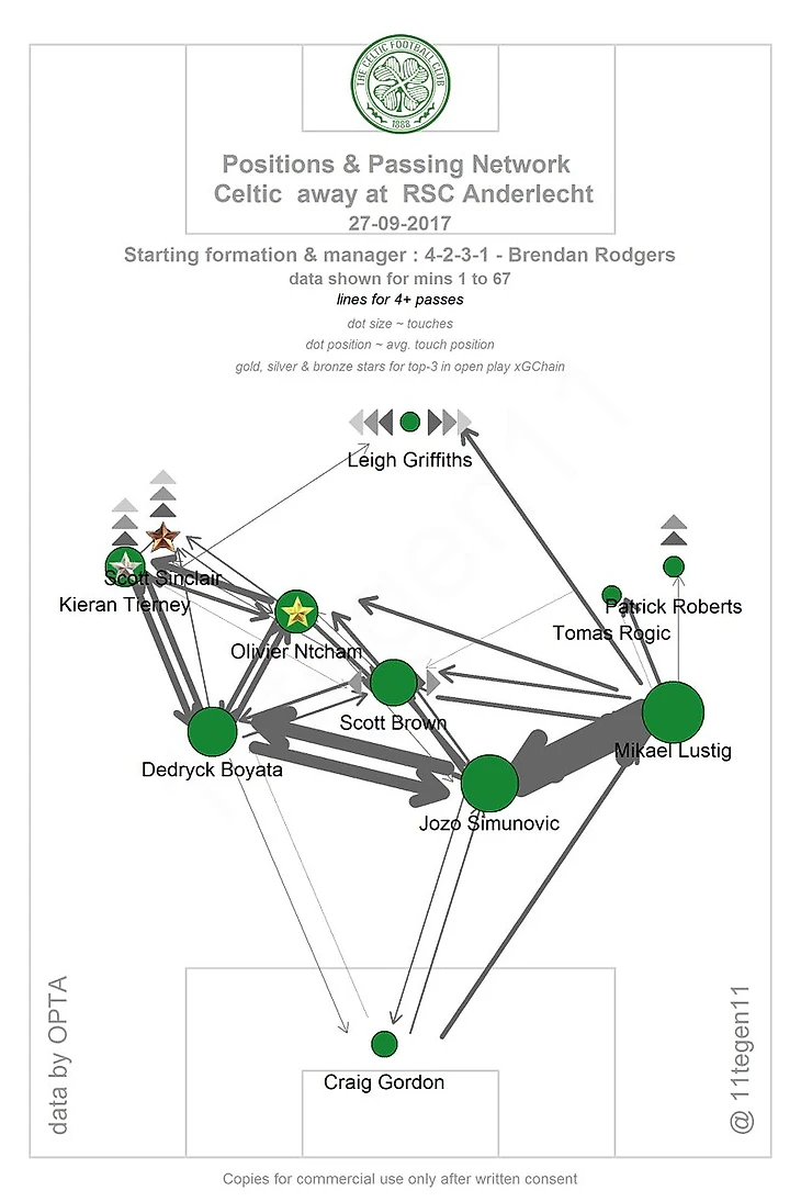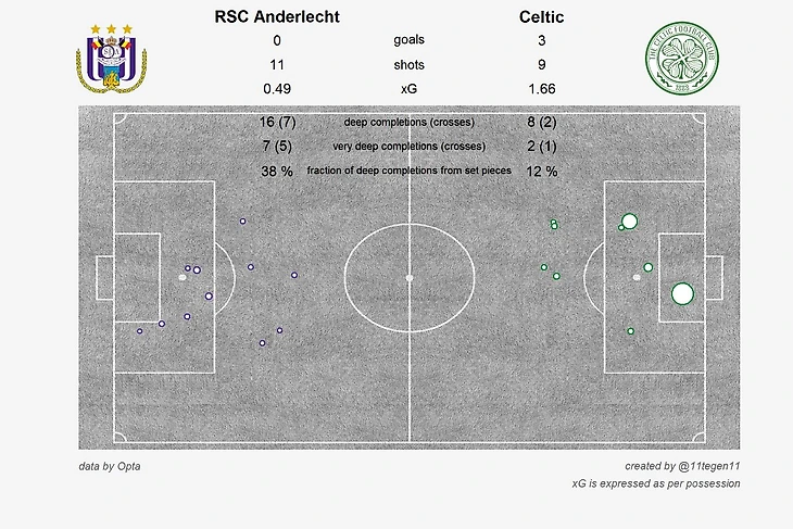 2. Группа ЛЧ и борьба за ЛЕ с Андерлехтом. Все решилось в первом очном матче в Брюсселе, Селтик строил игру через тотальной контроль мяча с глубоко посаженными опорниками, провоцируя бельгийцев на высокий прессинг, дальше лонгболл в освободившиеся зоны-силовой дриблинг-завершение. Итог 0:3 в пользу шотландцев, при этом хозяева не создали вообще ничего весомого за матч, оценить карту моментов и передач можно ниже.