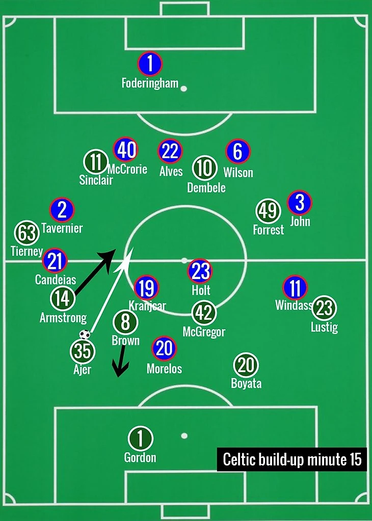 Через 15 минут Брендан Роджерс с мыслями «ну через центр так через центр», перестроил команду на игру в 2 нападающих (к Дембеле добавился Синклар) и начал перегружать фланги. Армстронг стал опускатся с позиции десятки в полуфланг, ниже своего левого защитника (Тирни), чем связывал одного из игроков Рейнджерс на этом фланге. Таким образом на правом фланге Рейнджерс создавались ситуации 2 в 1 (Синклар и Тирни против Тавернье), естественно МакРори как опорник вынужден был опускаться к совим защитникам чтобы играть по Синклару. Все это создавало огромную зону в центре поля, это зона Армстронга, после расчистки он врывался в нее из глубины.