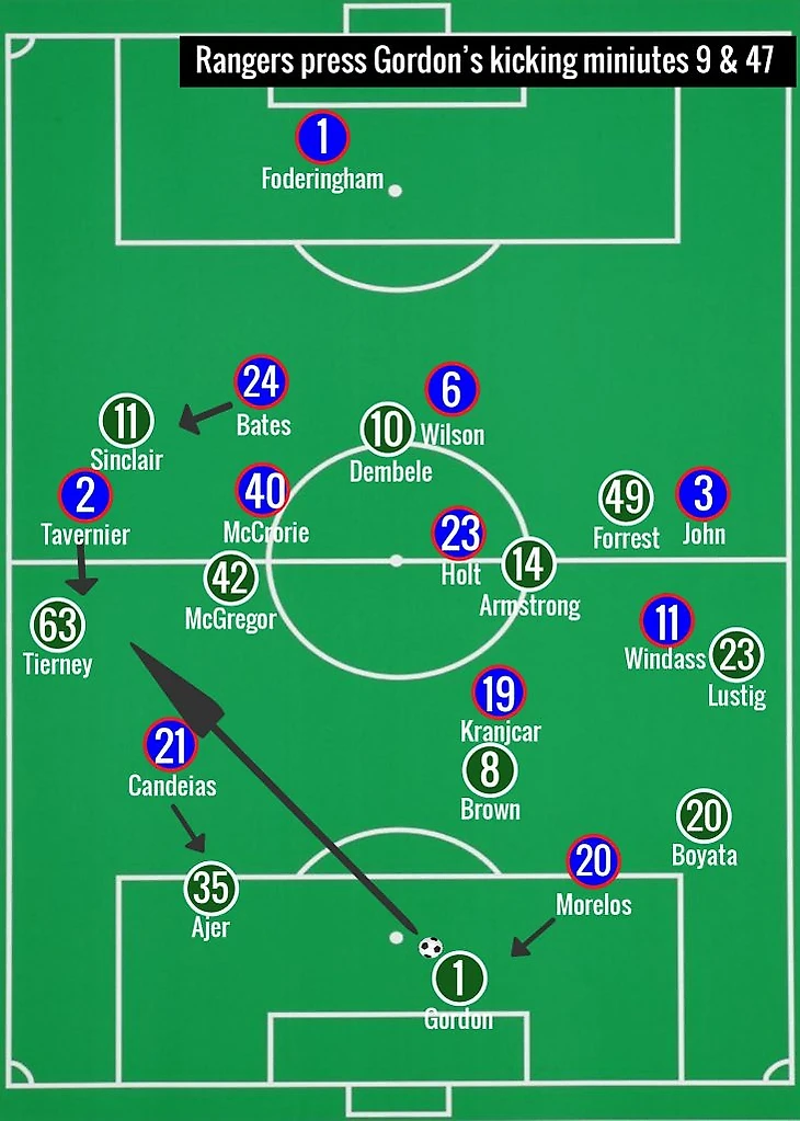 Вратарь Селтика Гордон (травмирован, но резервный имеет такую же склонность) склонен к диагоналям на крайних защитников. При прессинге центральных защитников мяч наверняка будет введен в игру диагональю на фланг, где Рейнджерс готовился прессинговать на приеме.