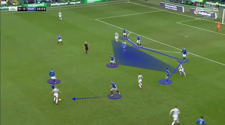 Селтик силен своими быстрыми флангами, поэтому тактика Рейнджерс заключалась в выдавливании атак Селтика в центральные зоны через прессинг. При обороне на своей трети поля Рейнджерс располагал защитников очень узко, вместе с опорником они закрывали атакующее трио Селтика в ловушку:
