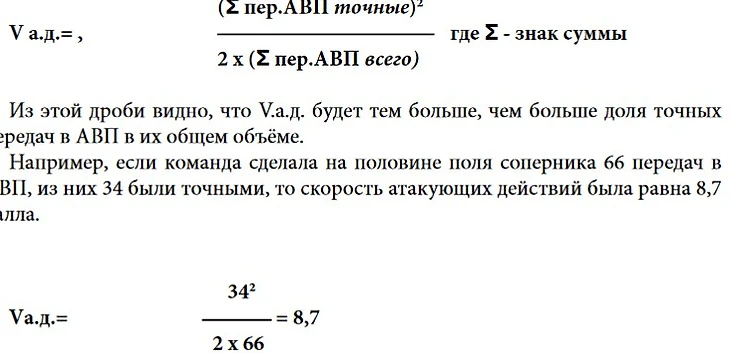 Эта скорость атакующих действий высчитывается по простой формуле и описывается в книге Павла Черепанова, который работал в научной группе у Бердыева в "Рубине" - книга "Теория и практика в подготовке команды мастеров". Нас интересует в первую очередь глава 3.Немного терминологии. Передачи в АВП - это передачи в активную выгодную позицию. Вот ее полное определение: