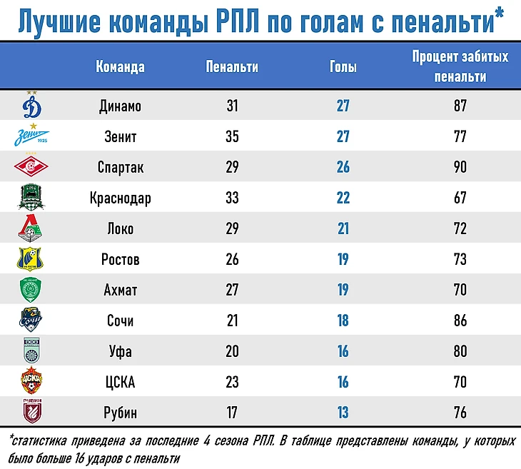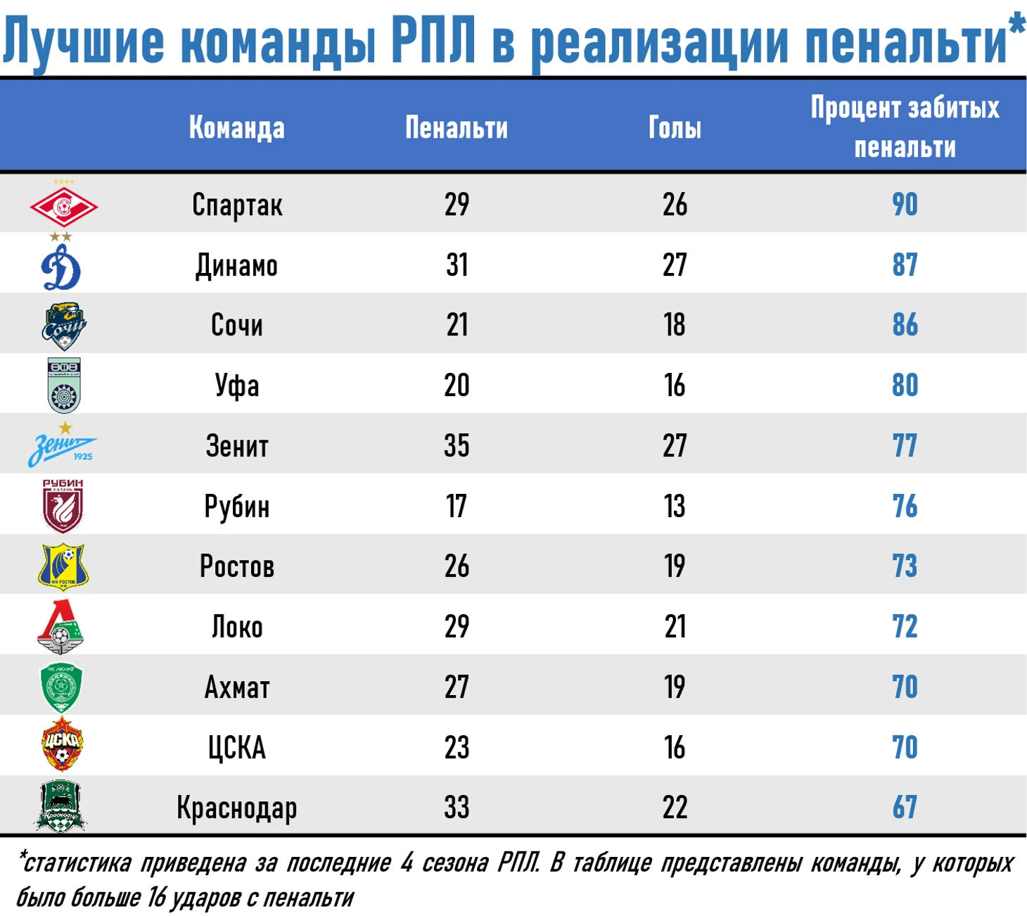 За последние 4 сезона в РПЛ было пробито 389 пенальти: 293 забито, 68 отбито и 28 промазано. Больше всех пенальти пробивал Зенит (35 ударов), на втором месте Краснодар (33 удара), на третьем Динамо (31 удар). По количеству голов с 11-метровой точки лидируют Зенит и Динамо (27 голов), за ними идёт Спартак (26 голов). При этом у кб лучшая реализация - 90% пенальти было забито. За ними идут Динамо (87%) и Сочи (86%), а дальше пропасть. Отдельно нужно отметить полный провал Краснодара (22 из 33 забитых пенальти).