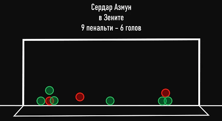 К сожалению, второй пенальтист Зенита Сердар Азмун также не блистал в том сезоне. Тактика иранца при исполнении пенальти довольно проста - разбежаться получше и ударить со всей силы. С точностью у Азмуна всегда были проблемы, поэтому если вратарь угадывал угол, то у него были большие шансы, чтобы отбить удар. В сезоне 2020/21 у Сердара 3 гола из 5 попыток. А общий итог Зенита в том сезоне 6 из 11 (55% забитых пенальти).