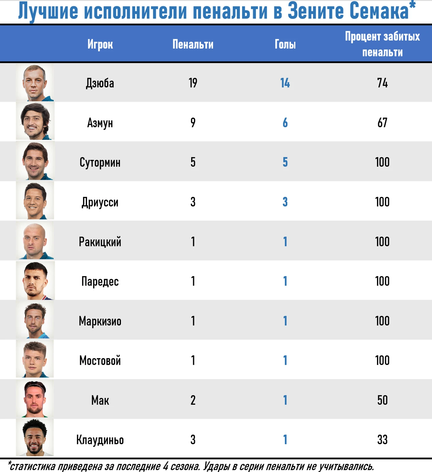 Штатным пенальтистом за рассматриваемый период времени был Артём Дзюба. Его статистика по ударам с пенальти серьезно влияла на общую статистику Зенита. Сезон 2019/20 у СБГ стал лучшим по проценту забитых пенальти (93%). Такого высокого процента удалось достичь благодаря Дзюбе, который реализовал все свои попытки (9).