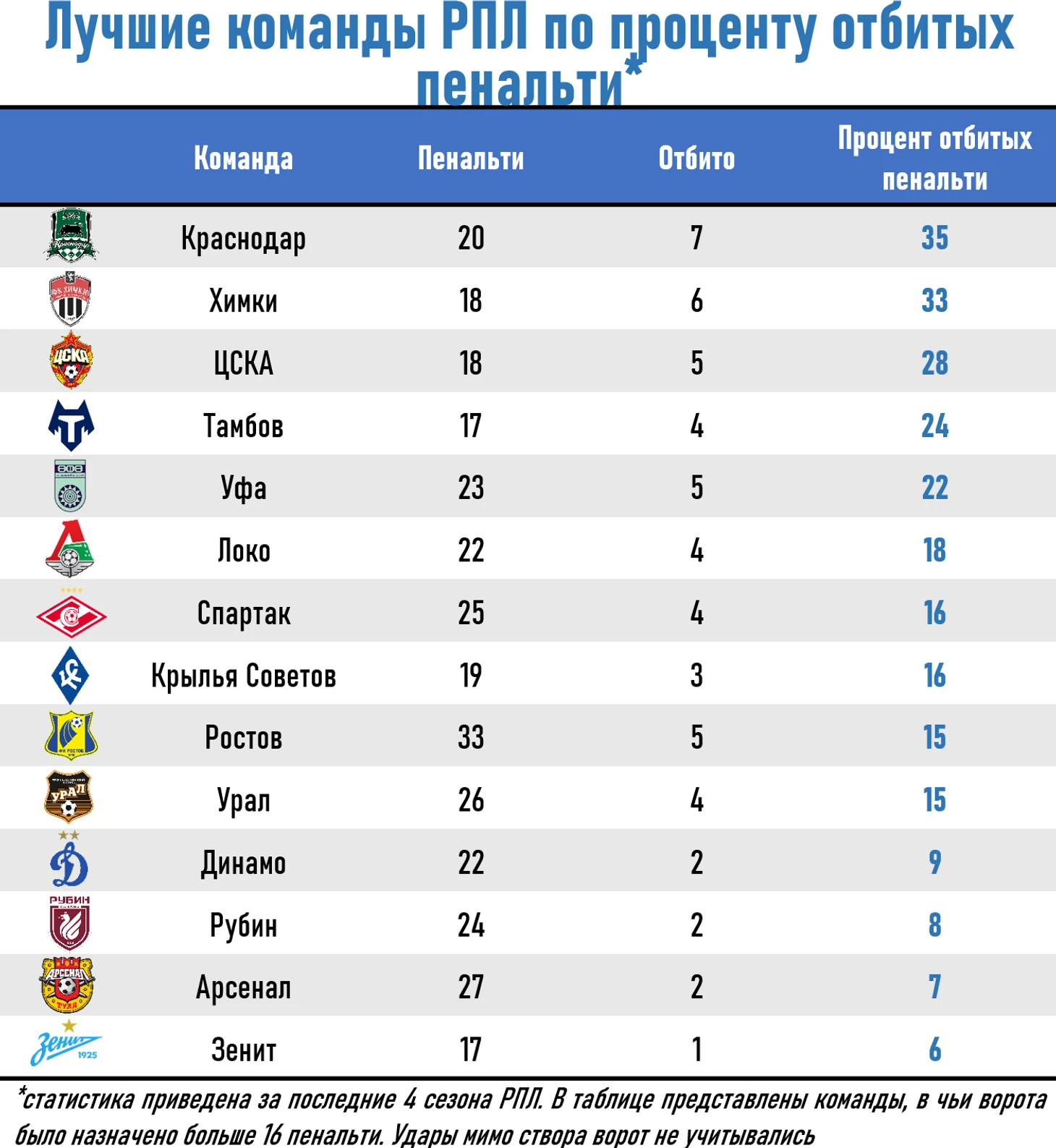 Лидером по отбитым пенальти за последние 4 сезона является Краснодар (7), на втором месте идут Химки во главе с Лантратовым (6), третье место с 5ю отбитыми пенальти делят Ростов, Уфа и ЦСКА. В процентом соотношении лидер все также Краснодар (35% отражённых пенальти), Химки на втором месте (33%), ЦСКА на третьем (28%). А где 4емпион страны? В ворота Зенита было назначено 17 пенальти и только 1 был отбит (6% отражённых ударов). СБГ идут на уверенном последнем месте.