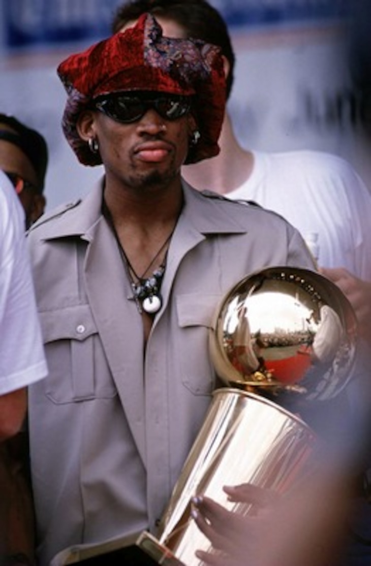 Деннис Родман совершенно точно является одним из самых неоднозначных персонажей в истории ассоциации. Если не самым. Если бы лига вручала призы за самые дикие выходки, превосходство "червяка" над всеми остальными было бы неоспоримым. Недавно один из самых титулованных игроков в истории получил признание на высшем уровне - его ввели в Зал Славы. 2 приза лучшему защищающемуся игроку лиги наряду с бесчисленными номинацими в символические пятерки по игре в защите значительно повысили его рейтинг в нашем топ-листе. Но самые главные его заслуги состоят в феноменальной игре на подборе, которая помогла партнерам Родмана по "Детройту" и "Чикаго" и самому Деннису аж 5 раз примерять чемпионские перстни.
