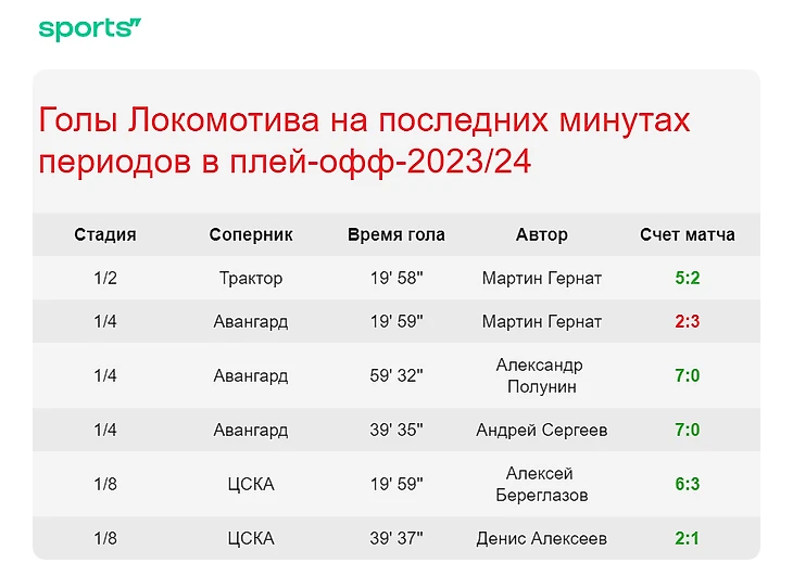 Всего за розыгрыш Кубка Гагарина-2024 у «Локомотива» набралось шесть шайб на последних минутах периодов. Это 16,2% от общего количества голов команды (37).