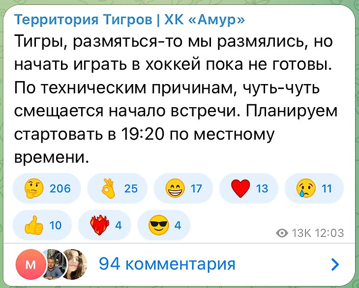 Через 75 минут с момента запланированного старта игры и вышел тот самый пресс-релиз от лиги. В нем также сообщили, что с клубами согласовано новое время начала матча – 14:00 по Москве (21:00 по Хабаровску).