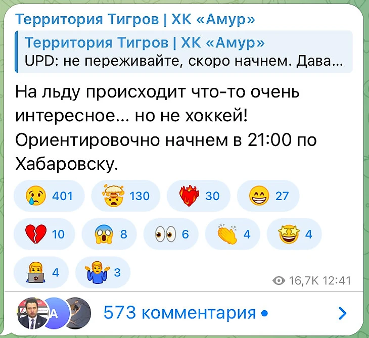 Третье обновление оказалось ожидаемым: игру отодвинули в общем уже на два часа! В комментариях телеграм-канала «Амура» на полную работало сарафанное радио – люди отправляли фото и видео со стадиона. На них видно, что лед был поврежден рядом со скамейками команд, а технический персонал пытался все исправить.