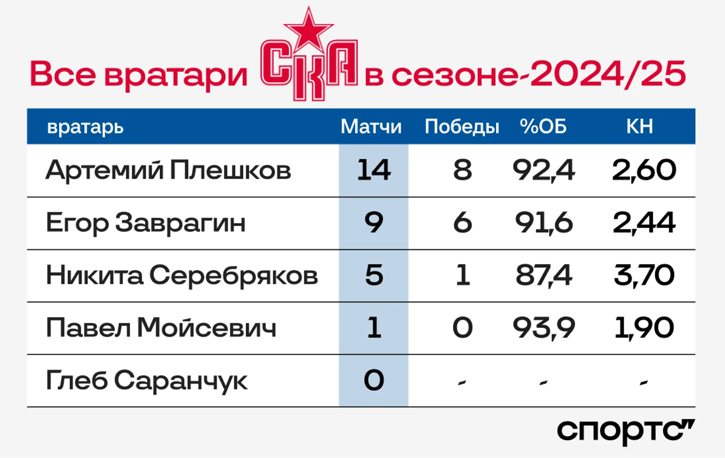 После смены обстановки Заврагин не так успешен, как в «Сочи». Отчасти это связано с меньшей нагрузкой: в «Сочи» по воротам Егора бросали в среднем 34 раза, а в СКА – 26,4. Поэтому просел и процент отраженных бросков: 94,1% в аренде и 91,6% в СКА.