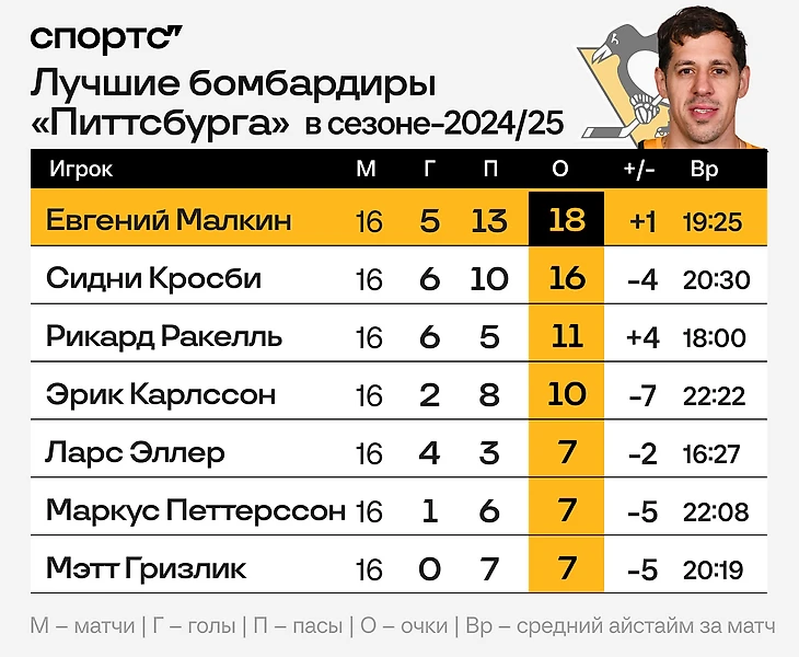 Малкин тащил «Питтсбург» не только в этой игре. Сейчас он является лучшим бомбардиром команды с 18 (5+13) очками в 16 матчах. Да, даже у Кросби меньше (16 баллов), не говоря уже об остальных.