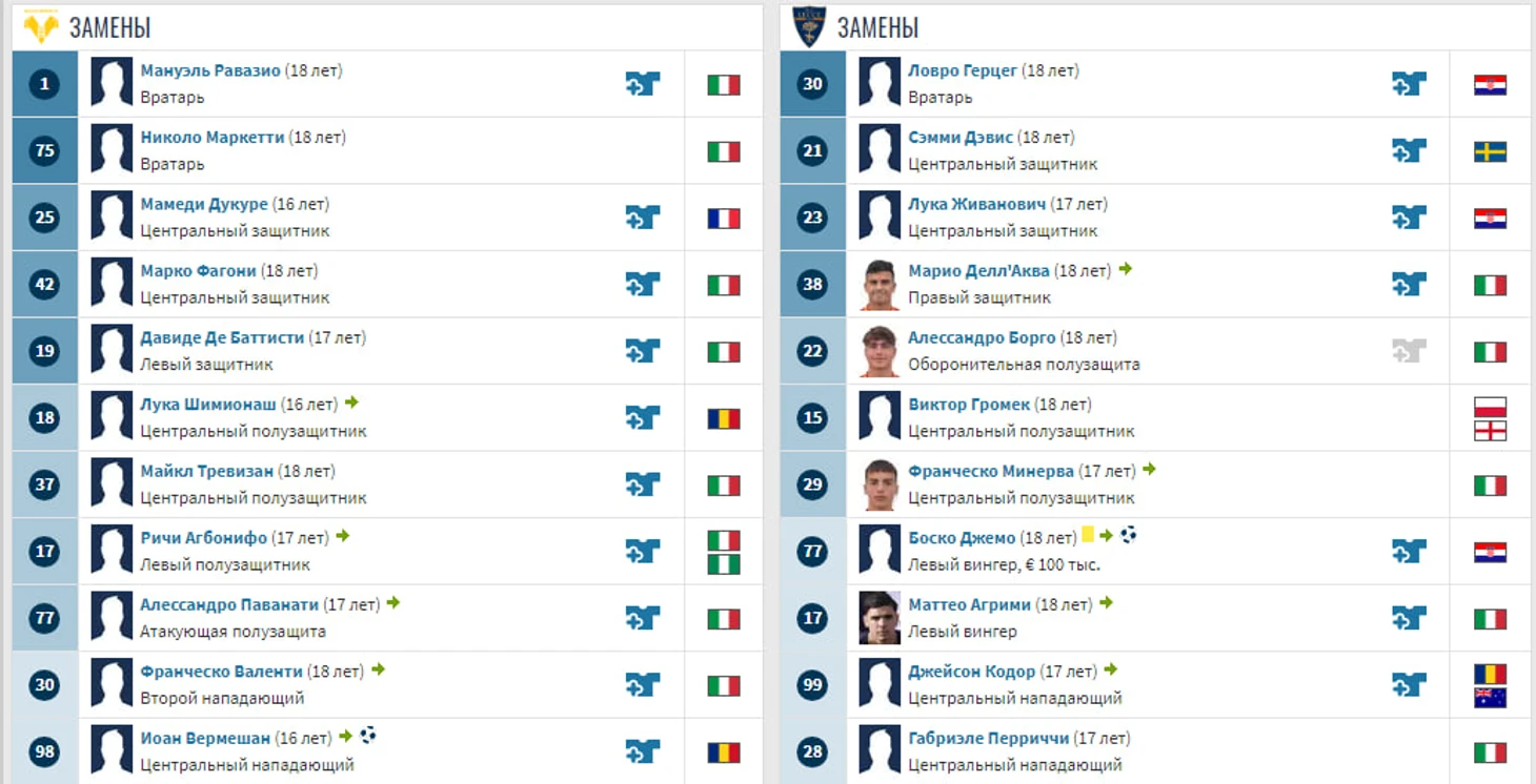 Больше всех игрового времени в Primaverе сезона 23/24 получили игроки с французским паспортом - 18'273 минуты, далее с румынским - 15'080, и шведским - 11'568 мнут.