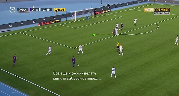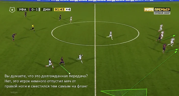 Но, прокидывая вперед мяч, далеко отпускает снаряд от стопы, что чревато, как потерей мяча, так и изменением и замедлением направления атаки.