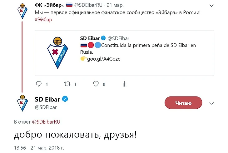 Чуть больше года назад я создал в твиттере русскоязычный аккаунт, посвященный «Эйбару». Вскоре это заметили болельщики клуба не только из Испании, но и из других стран. На тот момент у «Эйбара» было более тридцати фанатских сообществ (исп. peña) по всему миру. Я познакомился с главой американской пеньи Джоном Сэйгером, он помог мне привлечь англоязычную аудиторию; затем связался с основателем польской пеньи — им оказался 18-летний Михал Ратайчик.