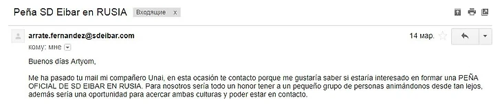 Через пару недель мне снова написала Аррате, но уже по другому поводу: она предложила мне зарегистрировать первую российскую пенью «Эйбара». Письмо начиналось так: «Для нас было бы честью заручиться поддержкой небольшой группы болельщиков, живущих так далеко. Кроме того, это возможность сближения двух культур».
