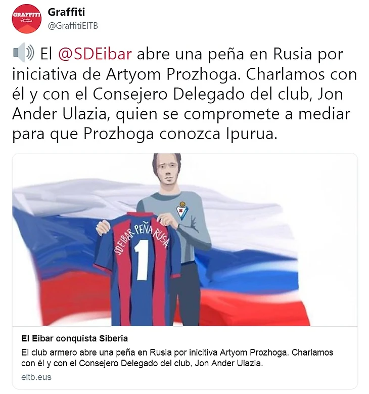 Артём Прожога: История и правда удивительная — как и у самого «Эйбара». Лично для меня всё началось ещё шесть лет назад, тогда я обозревал Лигу Аделанте на русском языке и начал следить за «Эйбаром», когда команда играла во втором дивизионе. Информации про «оружейников» на русском языке было немного, и, поскольку я учился на переводчика в университете, решил делать всё сам. Я создал аккаунт в «Твиттере» и блог, где публиковал новости из жизни команды. Через год это заметил «Эйбар» и предложил зарегистрировать первую пенью «Эйбара» в России. В марте нашему фан-клубу исполнился год. Сейчас в нём пятеро участников. Вы можете найти наши страницы в социальных сетях по запросу SD Eibar Peña Rusa.