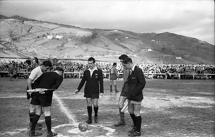 Судья бросает жребий. Эта традиция — пожалуй, единственное, что осталось неизменным на «Ипуруа» с тех времён. Обратите внимание на трибуны, если так можно назвать несколько рядов скамеек.