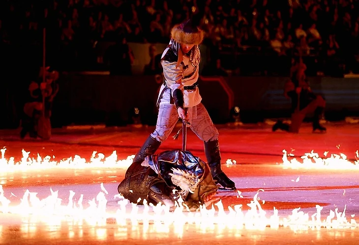 В истории татар было много войн, много страданий и потерь. Любые сражения - это сражения воинов, символизирующих силы добра и зла, поэтому извечные противостояния с врагом в народных эпосах изображаются как борьба со злым Драконом. Крылатое чудище Дракон Зилант–главный герой татарского эпоса, защитник и символ Казани. По одной из легенд в древности Казань находилась выше по течению реки на высокой горе. Местные девушки пожаловались царю, что им надоело носить тяжёлые ведра с водой с реки на вершину холма, и уговорили перенести город в низину. Но там находилось гнездо царя змей Зиланта, змеи нападали и создавали угрозу для жизни. Тогда люди выжгли всех змей, а Зилант улетел на гору Джилан (ныне Зилантова гора) на противоположном берегу реки. Долгое время чудище мстило казанцам и совершало на них налёты, пока отважный батыр не победил его в битве. Но есть и другая концовка легенды, по которой он был изгнан, затем одумался и стал помогать казанцам защищать город, делился мудростью и стал покровителем города. Мифический змей встречается на официальном гербе и флаге столицы Татарстана. На ледовой арене воины готовятся к отражению нападения Дракона, их танец должен поднять боевой дух и волю к победе. Бои сопровождаются зрелищными спецэффектами. Круги огня на льду усиливают жар сражений и, наконец, приближается кульминация и лед охватывают настоящие языки пламени.